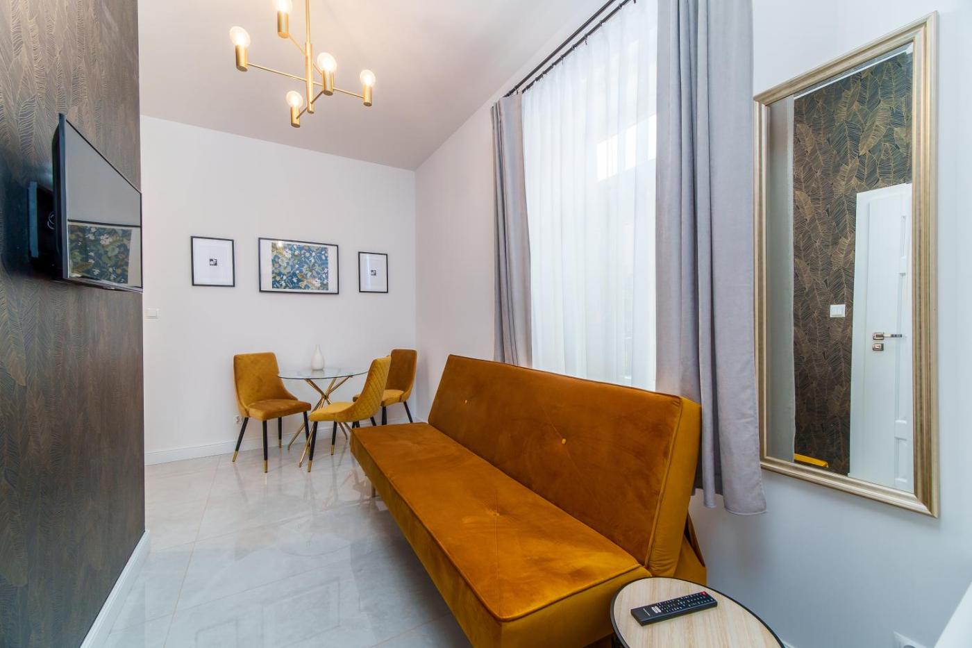 Apartament typu Deluxe z 1 sypialnią. This apartment comprises 1 living room, 1 separate bedroom and 1 bathroom with a shower and free toiletries. In the well-equipped kitchen, guests will find a stovetop, a refrigerator, a dishwasher and kitchenware. The apartment provides a flat-screen TV with streaming services, a washing machine, soundproof walls, a tea and coffee maker as well as a quiet street view. The unit offers 2 beds. Apartament - 4 osobowy. Powierzchnia pokoju ok.: 31 mkw.