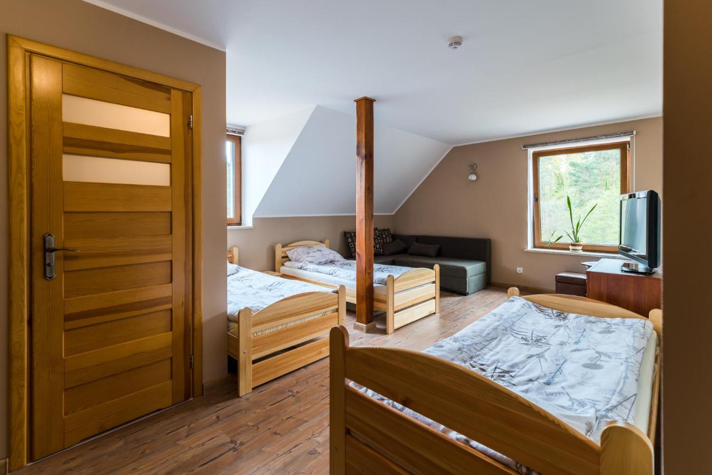 Pokój trzyosobowy z łazienką. The triple room offers a seating area, a wardrobe, as well as a private bathroom boasting a shower and a hairdryer. Guests will find a stovetop, a refrigerator, kitchenware and an oven in the well-fitted kitchen. The triple room also includes a barbecue. The triple room features a flat-screen TV with cable channels, a washing machine, a tea and coffee maker, executive lounge access as well as garden views. The unit has 3 beds. Pokój Trzyosobowy - 3 osobowy. Powierzchnia pokoju ok.: 20 mkw. ;