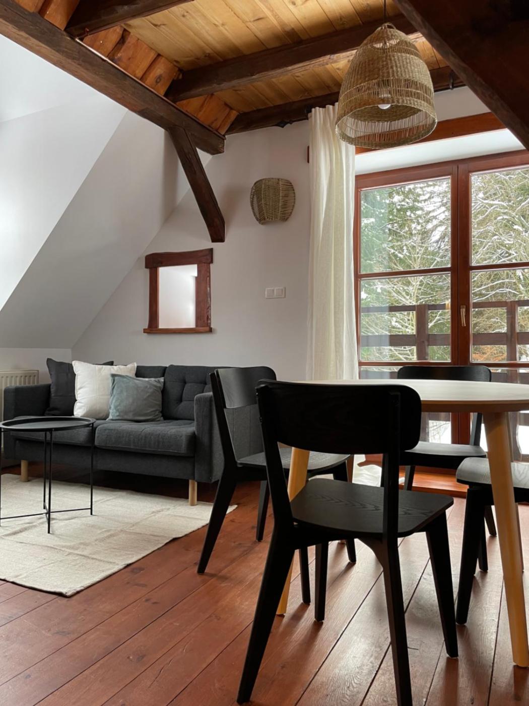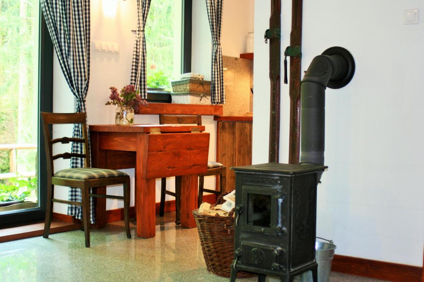 Domek. This chalets standout feature is the fireplace. Boasting a private entrance, this chalet also includes 2 bedrooms, a seating area and 2 bathrooms with a walk-in shower and a hairdryer. The kitchenette is fitted with a stovetop, a refrigerator and kitchenware. The chalet offers a flat-screen TV with cable channels, soundproof walls, a tea and coffee maker, a dining area as well as garden views. The unit has 4 beds. Domek - 6 osobowy. Powierzchnia pokoju ok.: 70 mkw. ;