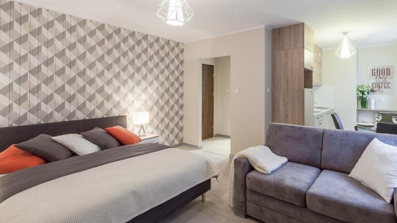 Studio z łóżkiem typu king-size i rozkładaną sofą – Wierzbowa 3. In the kitchen, guests will find a stovetop, a refrigerator, a dishwasher and kitchenware. The studio provides a private entrance, a wardrobe, as well as a private bathroom featuring a bath or a shower and a hairdryer. The unit offers 2 beds. Studio - 4 osobowy. Powierzchnia pokoju ok.: 40 mkw. ;